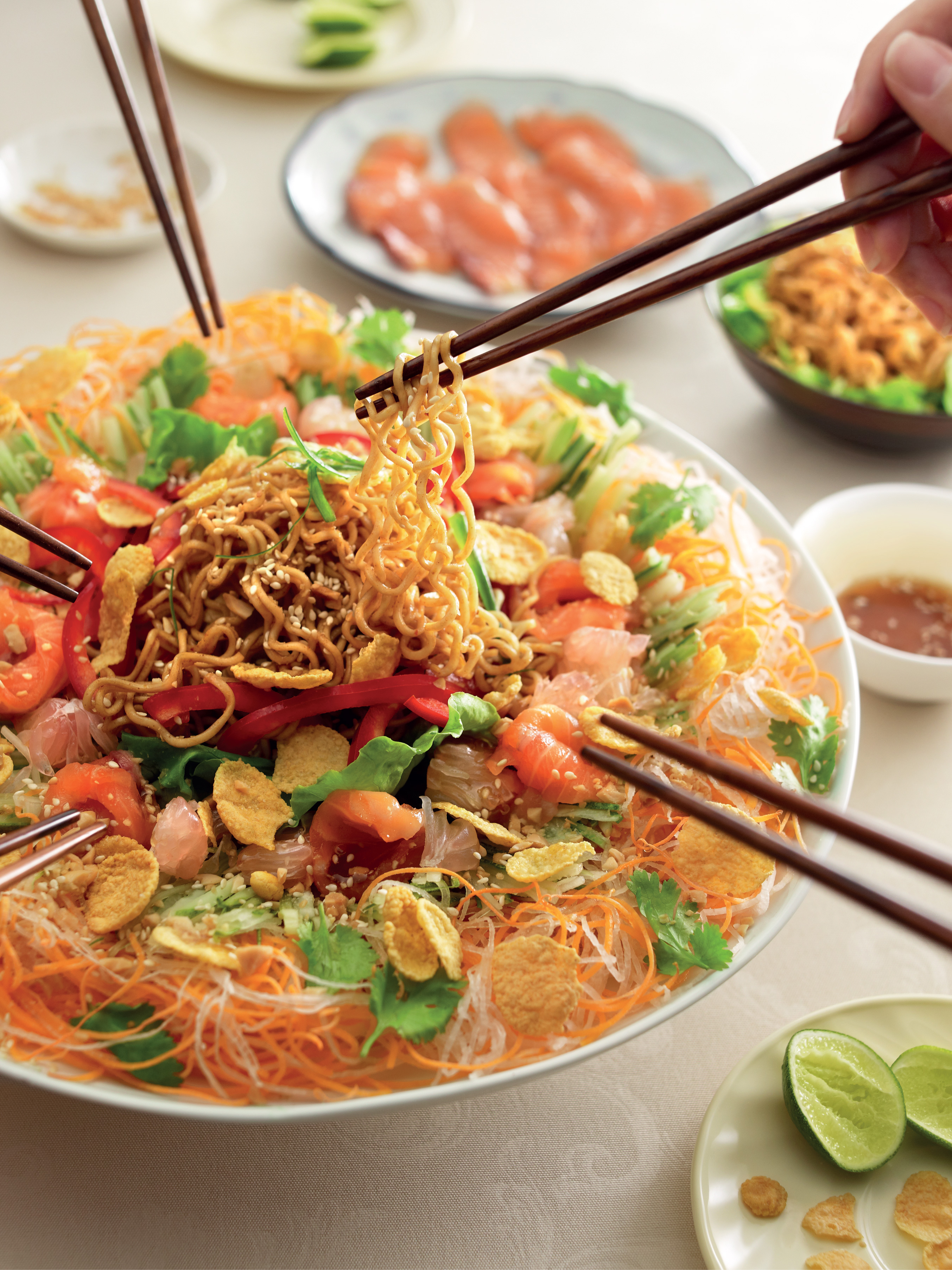 捞鱼生有七彩灿烂的好意头,而捞鱼生这个名称,又有风生水起和越捞越旺的意思做法: